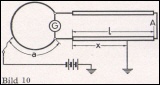 a) Schleifen-Methode (vorwiegend für Schwachstromkabel) Die Ader mit Erdschluß wird bei A mit einer gesunden Ader verbunden. Die Meßbrücke wird an die beiden offenen Enden angeschlossen (Bild 10). Bei Stromlosigkeit des Galvanometers ergibt sich bei einer Hundertteilung der Meßdrahtlänge: a : 100 = x : 2 l x = 2 l * a / 100 Die Ablesung am Schleifdraht ergibt also unmittelbar den Fehlerort in Prozenten der Schleifenlänge (= doppelte Kabellänge). Bei dieser Messung geht der Widerstand der Kabelzuführungen (Zuleitungen zur Meßbrücke und Verbindung bei A) in die Rechnung ein. Der dadurch entstehende Meßfehler wird also um so geringer, je kleiner der Widerstand der Kabelzuführungen ist. Bei dünnen, langen Kabeln (z. B. Fernsprechkabeln) wird der Meßfehler bei Verwendung entsprechend dicker Zuleitungen vernachlässigbar klein; bei dicken Kabeln kann er durch Verwendung entsprechend dickerer Kabelzuführungen, die außerdem zur Vermeidung von Übergangswiderständen gut verklemmt werden müssen, verringert werden.