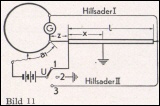 Drei-Punkte-Messung nach Graf (vorwiegend für Starkstromkabel) Diese Schaltung (Bild 11) gewährleistet höchste Genauigkeit, da der Querschnitt und die Länge der Hilfsleitungen (Zuleitung z, Hilfsader I und II) ohne Einfluß sind. Es können also als Hilfsadern I und II entweder gesunde Adern des Kabels oder fremde Leitungen beliebigen Querschnitts verwendet werden. Bei der Messung ist der Umschalter U der Reihe nach auf die Stellungen 1, 2, 3 zu schalten, wobei jedesmal auf dem Schleifdraht die Stelle festzustellen ist, bei der das Galvanometer stromlos wird. Sind die drei Ablesungen am Schleifdraht a1 a2 und a3, und ist 1 die einfache Kabellänge, so wird der Fehlerort errechnet: x = l * (a2 - a1) / (a3 - a1)