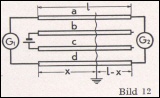 Der Messung liegt eine besondere Stromverzweigungs-Schaltung nach Graf zugrunde. Die Methode kann nur dann angewendet werden, wenn mindestens vier Adern mit Erschluß vorhanden sind. In die zwei Adern b und c (Bild 12) wird Gleichstrom geschickt, von dem ein Teil über die Erdwiderstände in die beiden Adern a und d eindringt und sich in diesen nach beiden Seiten im umgekehrten Verhältnis ihrer Widerstände verzweigt. Der eine Zweigstrom fließt durch das Galvanometer G1 der andere durch G2. Haben beide Galvanometer gleiche Empfindlichkeit, und sind a1 und a2 die Zeigerausschläge, so ergibt sich, wenn l die Gesamtlänge des Kabels ist: a1 : a2 = (l - x) : x x = l * a2 / (a1 + a2)