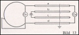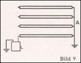 a) Prüfung auf Kabelbruch Alle Adern des Kabels werden bei A geerdet (Bild 9). Der Reihe nach werden sie mit einem Isolationsprüfer, z. B. mit einem Kurbelinduktor (siehe Kurbelinduktor) auf Stromdurchgang geprüft. Ist der Widerstand einer Ader ∞ oder sehr hoch, so ist mit Sicherheit Aderbruch vorhanden. b) Prüfung der einzelnen Adern auf Erdschluß Der Isolationswert der einzelnen Adern gegen Erde ist der Reihe nach festzustellen. Erdschluß ist bei sehr niedrigem Isolationswert gegeben. c) Prüfung der einzelnen Adern auf Nebenschluß (Berührung) Der Isolationswert jeder Ader gegen sämtliche anderen Adern ist festzustellen. Bei sehr niedrigem Isolationswert ist Nebenschluß (Berührung) vorhanden. d) Widerstandsmessung Mit Hilfe einer Widerstands-Meßbrücke ist der Widerstand sämtlicher Kabelschleifen zu bestimmen. Diese Messung dient gleichzeitig als Kontrollmessung.