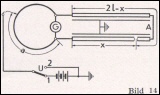 a) Messung mit Gleichstrom nach Graf (vorwiegend für lange Kabel) Die gebrochene Ader wird mit einer gesunden Ader bei A verbunden, die Meßbrücke an die beiden offenen Enden angeschlossen (Bild 14). Auf Stellung 1 des Umschalters U werden die beiden Kabelstücke x und 2 l - x geladen, auf Stellung 2 entladen. Der Schleifer wird auf dem Meßdraht so lange verschoben, bis das Galvanometer bei der Ladung bzw. Entladung keinen Ausschlag mehr zeigt. Ist Cx die Kapazität von x und C2 von 2 l — x, so gilt bei einer Hundertteilung der Meßdrahtlänge: a : (100 - 1) = C2 : C1 Da die Kapazitäten bei gleicher Leiteranordnung verhältnisgleich den Längen sind, so können diese an Stelle von C1 und C2 eingesetzt werden: a : (100 - a) = (2 l - x) : x x = 2l * (100 - a) / 100 Der Vorteil dieser Methode liegt darin, daß die Messung mit einem gewöhnlichen Galvanometer ausgeführt werden kann. Ein ballistisches Galvanometer ist also nicht erforderlich. Im Gegensatz zu den bisher aufgeführten Methoden wird eine höhere Meßspannung (etwa 100 V) benötigt.