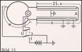 In dieser einfachen Form kann die Schaltung jedoch nur dann verwendet werden, wenn reine Aderunterbrechung vorliegt. Hat die Unterbrechungsstelle gleichzeitig einen Isolationsfehler, so wird zweckmäßig die Schaltung nach Bild 15 verwendet. Bei dieser wird in den Galvanometerstromkreis ein Schalter gelegt, der mit dem Umschalter U derart gekuppelt ist, daß das Galvanometer nur bei der Entladung des Kabels einen Stromstoß erhalten kann. Die Umschaltung von 1 auf 2 hat möglichst schnell zu erfolgen, am besten mit Telephonrelais und Taster.