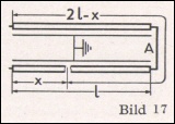 c) Messung mit Kapazitätsmeßbrücke (vergleich auch Kapazitäts-Meßbrücke) Die gebrochene Ader wird mit einer gesunden Ader bei A verbunden (Bild 17). Gemessen werden die Kapazitäten gegen Erde von x (= Ci) und von 2 1 — x (= C2). Da die Leitungslängen verhältnisgleich den Kapazitäten sind, ergibt sich: x : (2 l — x) = C1 : C2 x = 2 l * C1 / (C1 + C2) Mit der Kapazitäts-Meßbrücke läßt sich auch bei weniger guter Isolation höhe Meßgenauigkeit erzielen, da der Fehlwinkel durch einen Phasen-Abgleich- widerstand ausgeglichen und scharfes Tonminimum im Kopfhörer erzielt werden kann.
