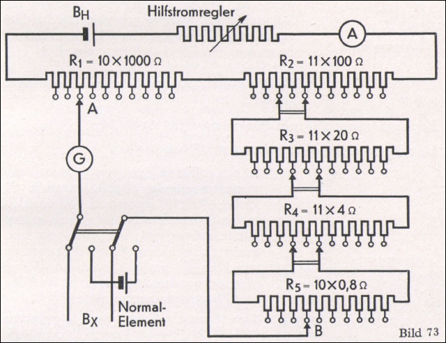 R2, R3 und R4 sind Doppelkurbel-Widerstände mit 10 Stellungen; der Abstand der beiden Schleifkontakte ist fest. R, und R5 sind Einfachkurbel-Widerstände. Bei der Messung wird zunächst der Strom aus der Hilfsstrombatterie Bh mit Hilfe des Strommessers A auf 0,1 mA eingestellt. Dann wird durch Einstellung von R1 ... R5 eine Spannung zwischen A und B abgegriffen, die der Spannung des Normalelementes entspricht (1,0183 V). Da diese Widerstände so bemessen sind, daß die Ziffer der Kurbelstellung gleichzeitig eine Ziffer des Spannungswertes darstellt, sind die Kurbeln von R2, R3, R4 und R5 auf 10, 1, 8, 3 zu stellen (Rt steht auf 0). — Durch den Umschalter wird diese Spannung gegen das Normalelement geschaltet und am Hilfsstromregler nachgeregelt, bis das Galvanometer keinen Ausschlag mehr zeigt. Dann sind beide Spannungen genau gleich und der Hilfsstrom beträgt auf fünf Dezimalstellen genau 0,1000 mA. |