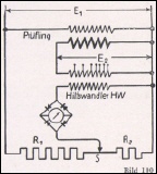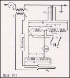 Bei dem Trafo-Übersetzungsmesser nach Keller (Bild 100) erfolgt die Messung des Übersetzungsverhältnisses durch Kompensation. Als Meßspannung genügt in den meisten Fällen die Netzspannung von 220 Volt, nur bei Transformatoren für sehr hohe Spannungen ist auch eine höhere Meßspannung erforderlich. Die Fehlergrenze beträgt höchstens 0,3%. |
