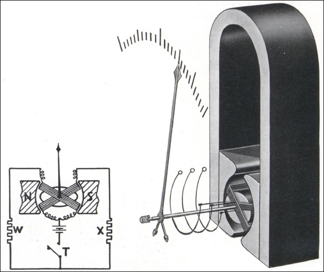 Das Kreuzspul-Messwerk besteht aus zwei festverbundenen, gekreuzten Spulen, die innerhalb eines Magneten um einen Eisenkern drehbar angeordnet sind. Der Luftspalt zwischen Magnet und Kern, das sogenannte Interferrikum, nimmt von der Mitte aus nach beiden Seiten zu, die Feldstärke im gleichen Maße ab. Beide Spulen sind gegeneinander geschaltet. Die Stromzuleitung erfolgt durch richtkraftfreie Metallbänder, sodass die Kreuzspule und der an ihr befestigte Zeiger im stromlosen Zustand keine feste Ruhelage haben. |